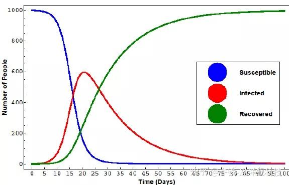 SIR模型中,处在不同状态的人数随时间变化的曲线