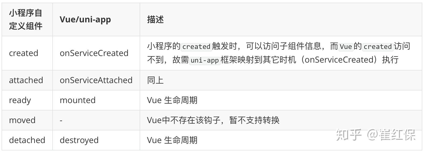 }在这个过程中,需处理小程序自定义组件和 Vue组件的属性对应关系及细节差异,如小程序组件的lifetimes: