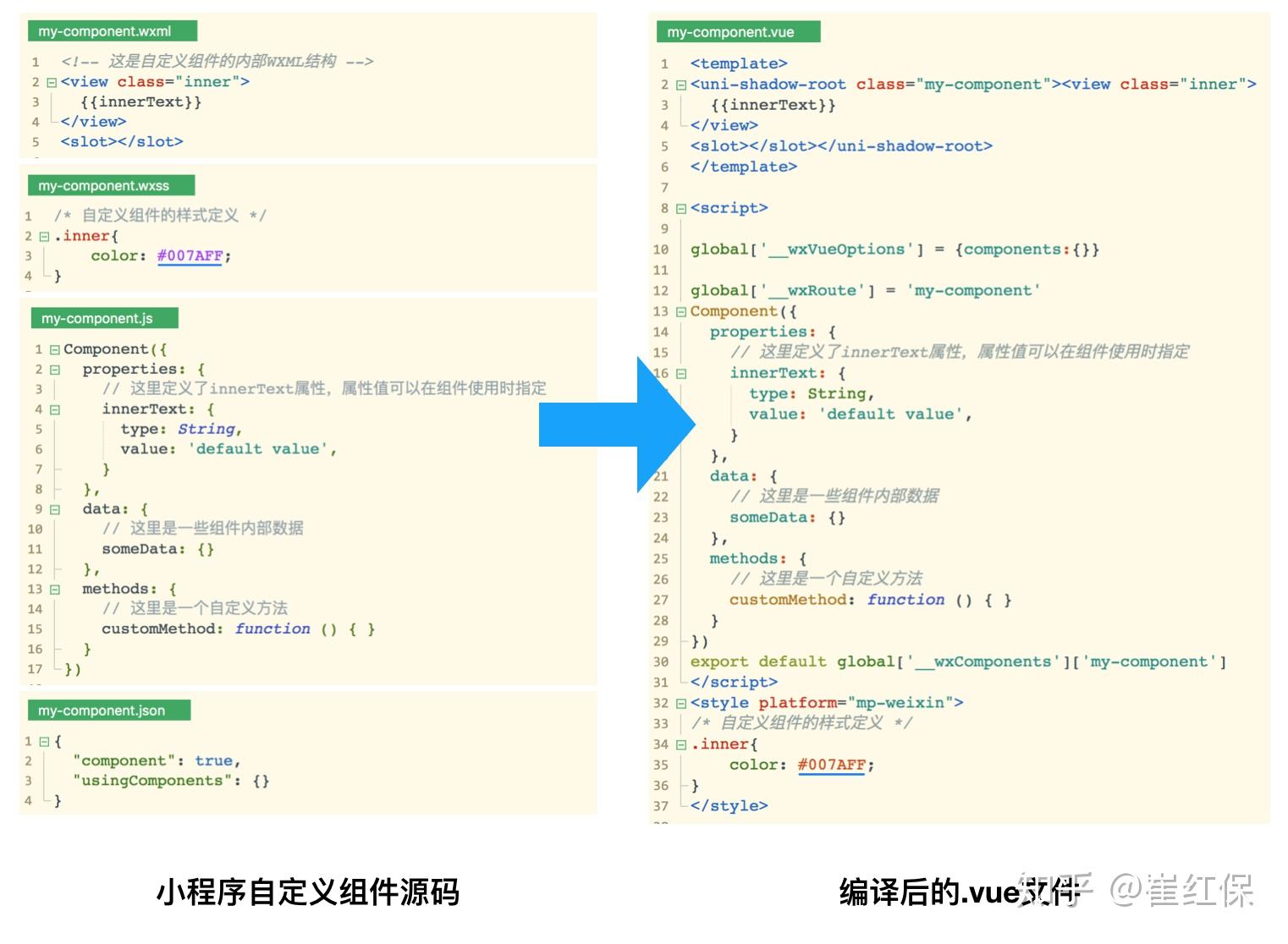 wxml/wxss/js/json文件到uni-app项目下,通过uni-app的编译器及运行时,保证小程序自定义组件在H5平台的正确运行。