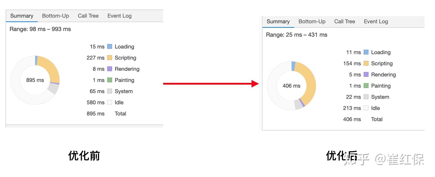 然后,我们再通过Chrome DevTools 的 Performance 面板,查看优化前后的性能数据,对比结果如下: