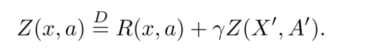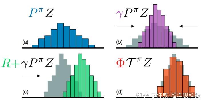 我们可以把Q学习中关于Q值的计算公式的的Q值和奖励直接替换成一个分布函数, 并得到贝拉曼优化公式的分布函数版. 注意, 当代数变量被替换成一个分布函数时候, 和这些变量有关的基本算符将变成算子形式, 这种改变保证了所有的基本运算都可以顺利的被继承下来,而方程的形式不变。具体算子在干什么, 我们可以把它理解为对一个分布函数进行的操作,也就是对一个函数进行的变换, 如下图所示。