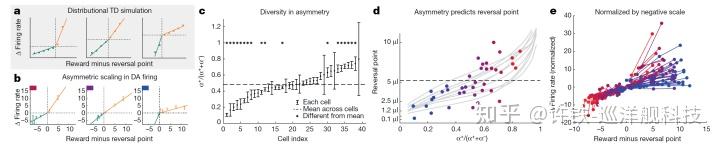 这一次,AI理论指导了生物发现, Deepmind根据这个想法测量了真实的多巴胺神经细胞, 也观测到了性质相同的现象。也就是不同细胞对正向和负向TD误差的不确定性, 以及它导致的可观测的信号reversal point的不同。