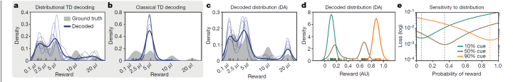 最终的结果, 是每个细胞都包含了真实奖励的部分信息, 而整个群体可以同时编码整个奖励的分布函数, 包含峰位数, 方差, 和均值等等信息。这里的具体方法是不同的细胞实质编码了期望的峰位数(由对正负TD误差的不确定性alpha+, alpha-决定), 而把整个群体加在一起, 就可以得到分布函数。