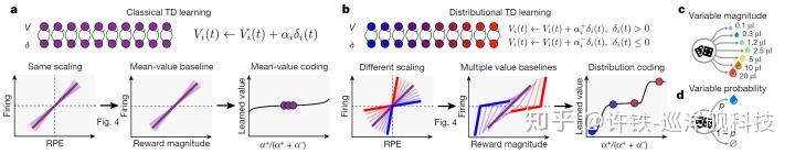 具体怎么实现的?如下图,我们看到不同的多巴胺细胞, 如同下图a中V, 和delta组成的一对圆圈,如果这些细胞的参数都相同, 就如同图a, 每个细胞都以同样的方法在计算未来奖励的期望。而一旦每个细胞的参数发生变化, 具体体现在加入一个对正向和负向TD误差迭代的不对称性(传统理论是一样的), 这导致了不同的细胞所计算的V函数不同, 因此对TD误差的reverse point也不同(也就是TD误差为正或为负需要的V值)。