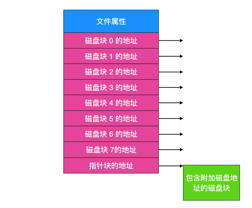 在使用 inode 或任何类似 inode 的系统中,另一个性能瓶颈是,读取一个很短的文件也需要两次磁盘访问:一次是访问 inode,一次是访问块。通常情况下,inode 的放置如下图所示
