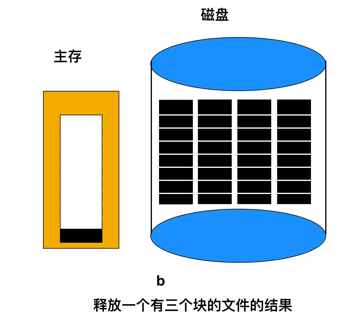 上面内存中的指针块仅有两个空闲块,如果释放了一个含有三个磁盘块的文件,那么该指针块就会溢出,必须将其写入磁盘,那么就会产生如下图的这种情况。