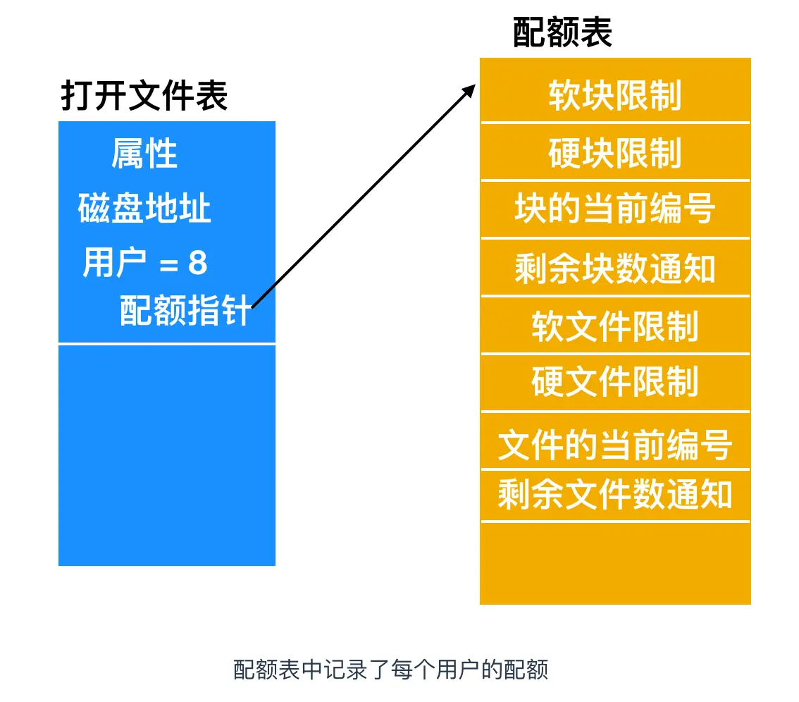 在用户打开一个文件时,操作系统会找到文件属性和磁盘地址,并把它们送入内存中的打开文件表。其中一个属性告诉文件所有者是谁。任何有关文件的增加都会记到所有者的配额中。