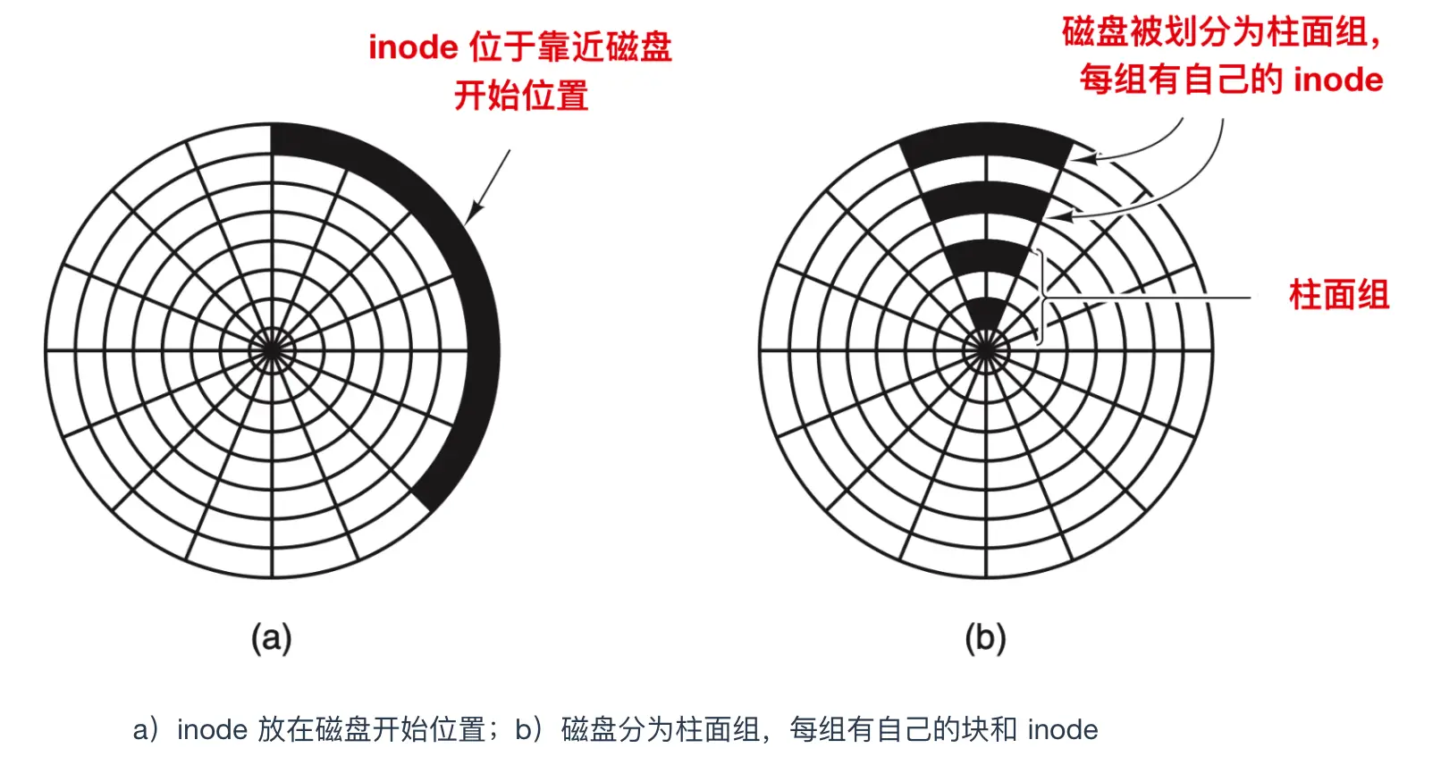 一个简单的改进方法是,在磁盘中部而不是开始处存放 inode ,此时,在 inode 和第一个块之间的寻道时间减为原来的一半。另一种做法是:将磁盘分成多个柱面组,每个柱面组有自己的 inode,数据块和空闲表,如上图 b 所示。