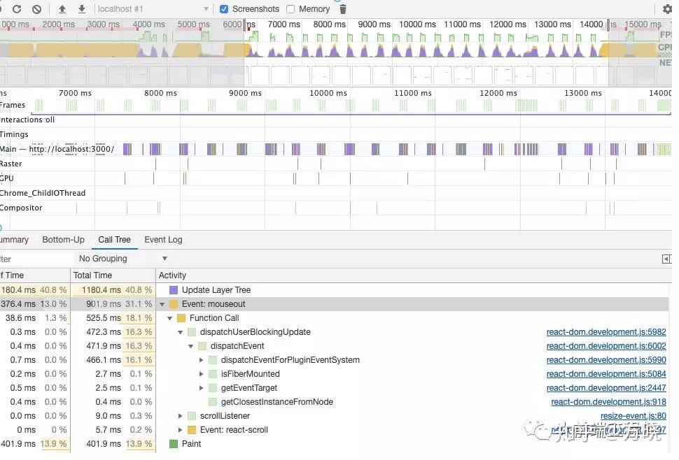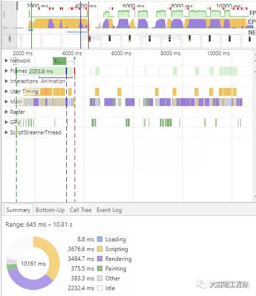 下面是从初始化到不断滚动,触发 onScroll 重绘的 Performance 截图。(0 - 10ms)