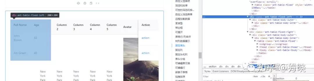 疑问:固定列(Fixed)属性是如何同步主内容 Table Cell 和左右 Fixed Table Cell 的高度?绝对布局会造成 Fixed Table 和 Main Table 之间列元素的 Layout 信息(如 cell height,cell width)割裂。必须使用某种方式同步割裂的信息。这里 Element - React 和 Antd 对于 Table 在 fixed 的实现差距是很大的。