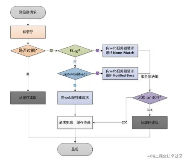 当浏览器发起请求验证资源时,如果资源没有改变,那么服务器返回 304 状态码,并且更新浏览器缓存有效期;如果资源发生改变,那么服务器返回 200 状态码,并且返回相应资源,更新浏览器缓存有效期。