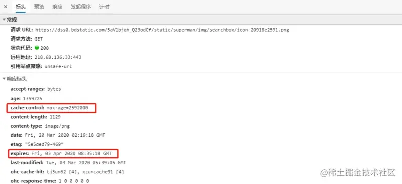 强缓存是指在缓存期间,请求不会发送到服务器,浏览器直接返回缓存结果,需要设置 Header: