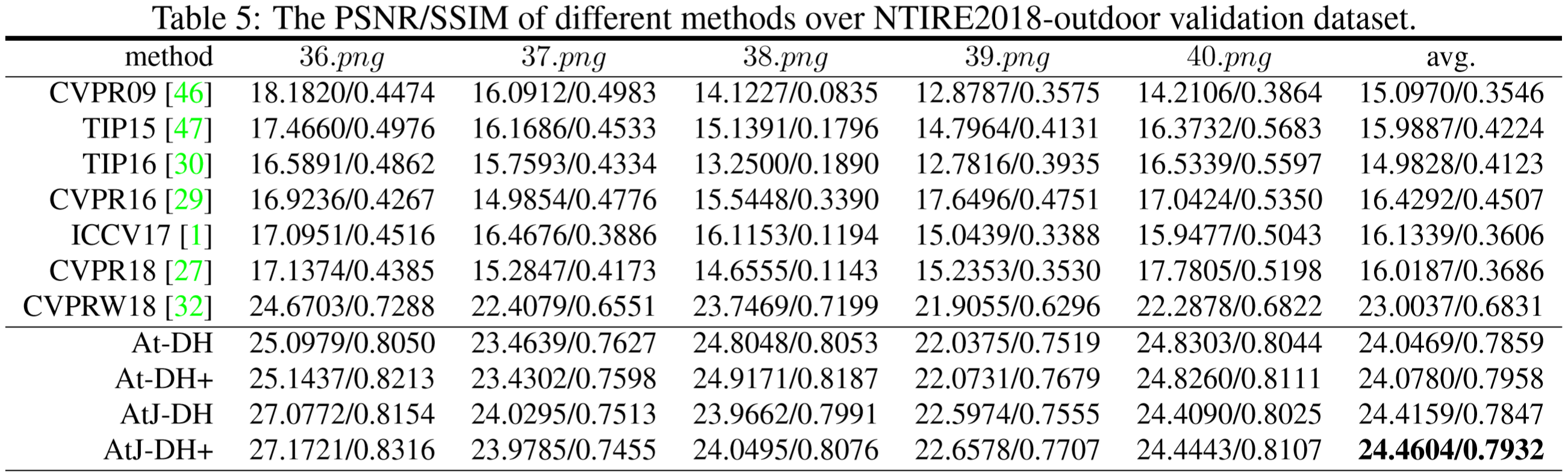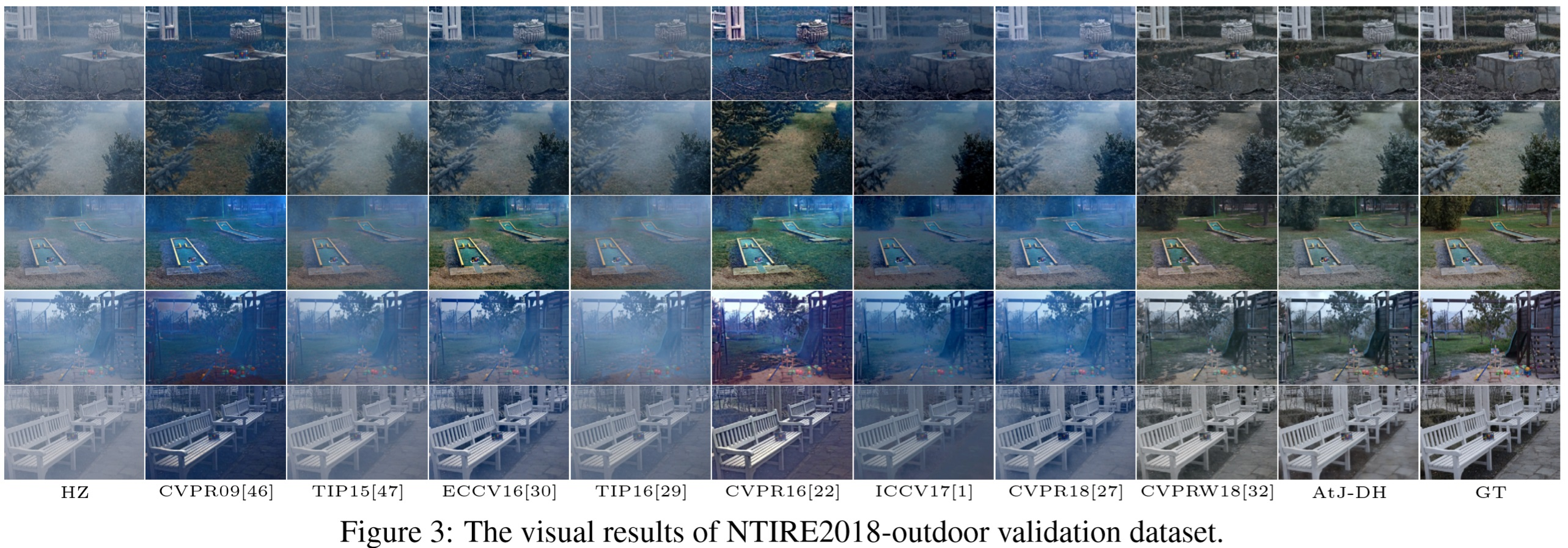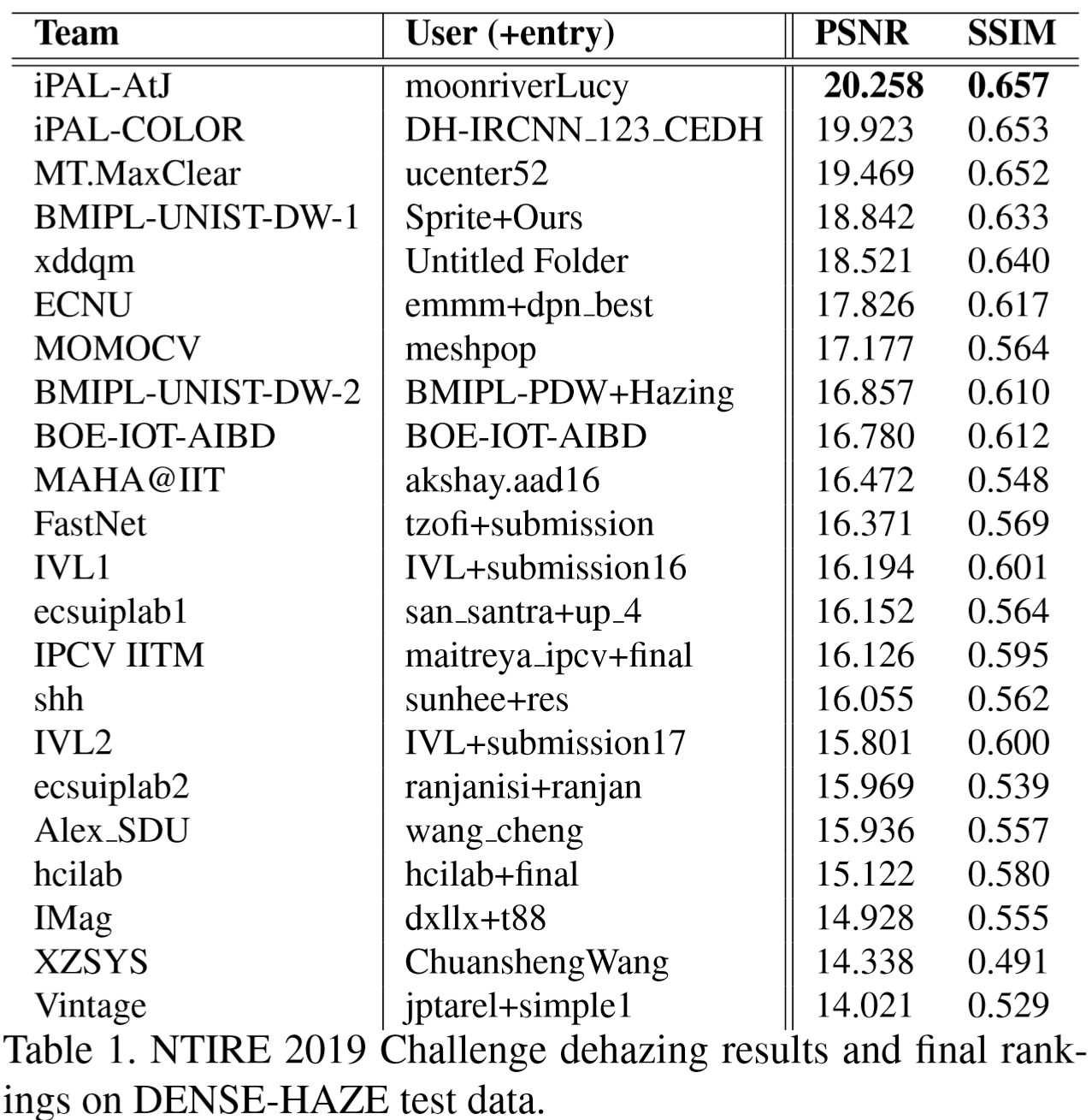 该文章是NTIRE 2019去雾竞赛中的冠军,其核心之处在于给出了两个新网络At-DH和AtJ-DH并且在 NTIRE2019和NTIRE2018的数据集中得到了较好的指标。该文章是实验性质的论文,没有太多的理论和观点的分析,只以高指标为目标。