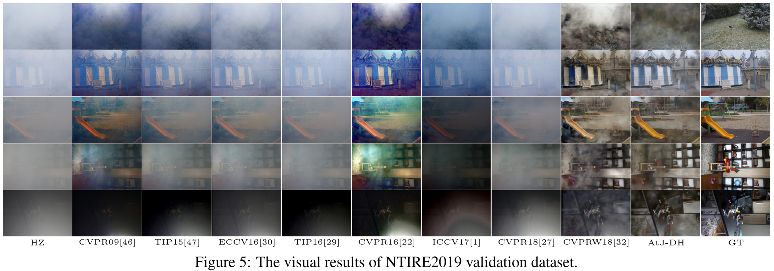 ,在训练中经常使用合成数据集。而在真实场景中,雾的浓度可能要比大多数合成的有雾图像中的雾浓度要浓。因此认为NTIRE2019提供的数据集代表了真实场景的去雾。