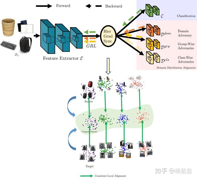 本文提出一种层级梯度同步的方法,首先在域、类别、类组三个级别通过对抗学习进行条件分布的对齐,然后通过约束不同级别的域判别器的梯度保证相同的方向和幅度,由此提高分布对齐的内在一致性,加强类别结构的保留,从而得到更准确的分类结果。该方法在当前主流测试集Office-31,Office-Home,VisDA-2017上的结果都验证了其有效性。