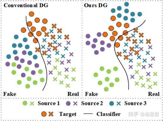 其中主要思想在于,对于不同数据集中的正常样本,我们去学习一个领域不变的特征空间;但是对于不同数据集中的攻击样本,我们去学习一个具有分辨性的特征空间,使相同数据集中的攻击样本尽可能接近,而不同数据集中的攻击样本尽可能远离。最终效果会使攻击样本在特征空间中张成更大的区域,而正常样本仅仅处在一个紧凑的区域中,从而能够学习到一个对于正常样本包围更紧致的分类器,以达到在未知的目标域上更好的性能,如下图右边所示。