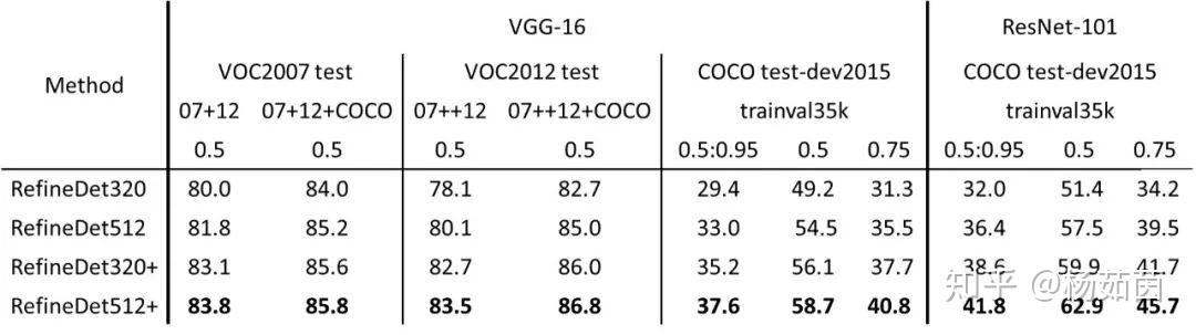 表2是RefineDet算法在VOC2007,VOC2012,COCO上详细的结果。由于显存的限制,只训了输入为320和512的两个模型。从这些结果中,有以下几点结论: