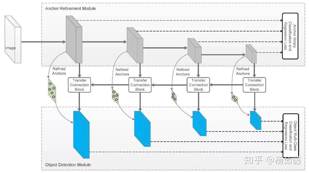 上图是RefineDet的检测框架示意图,由ARM(Anchor Refinement Module)和ODM(Object Detection Module) 模块组成,它俩由TCB(Transfer Connection Block)连接。ARM专注于二分类,为后续ODM滤掉大量的简单负样本,同时进行初级的边框校正,为后续ODM提供更好的回归起点。ODM把ARM优化过的锚点框作为输入,专注于多分类和精准的边框校正。其中ODM没有使用耗时的逐区域操作,而是直接通过TCB转换ARM特征、融合高层特征,以得到感受野丰富、细节充足、内容抽象的特征,用于进一步的分类和回归,使得一步法检测器RefineDet具备了二步法的二阶段分类、二阶段回归、二阶段特征这3个优势。