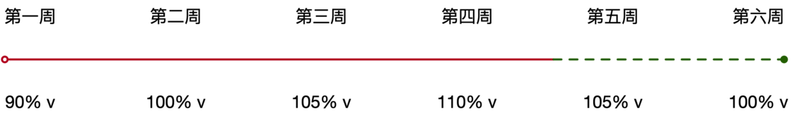 这时候我们可以考虑非完全增量再减量的训练方式,以我为期六周的训练周期为例,设定某一个有效训练周的容量为 v,我的训练增减幅如下图所示: