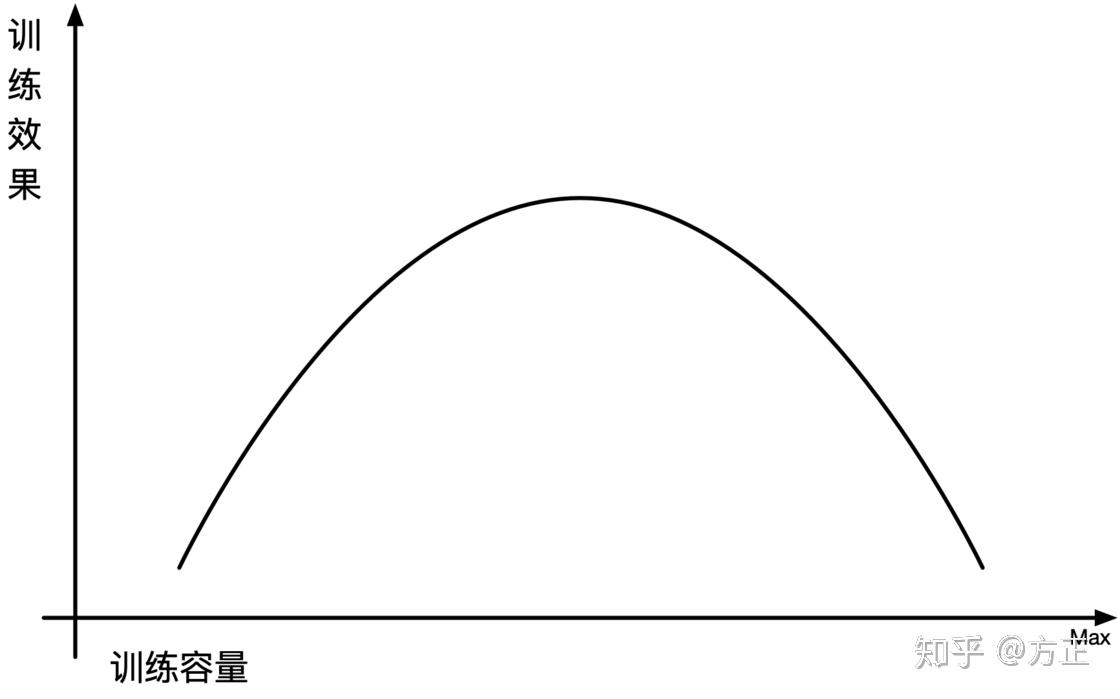 必须重视的是,即使单次训练中我们已经筹备了休息时间,但是放在一个完整的训练周期里这些休息是不足够的,而且肌肉的疲劳和身体的疲劳也有不同:身体忙了一天晚上睡个好觉第二天依旧容光焕发;但肌肉的疲劳和恢复并非立竿见影并且是会逐渐积累的,若是长此以往的不断递增容量进行训练,短期内我们的确可以举起越来越重的铁,但是再稍长一些时日肌肉必定受伤,并且训练效果增长得也越来越缓慢,甚至变成负增长,因为我们的容量和训练增效其实是一个倒 U 型的曲线关系: