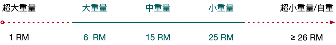 - 如果你的目标是「获得更高的力量水平」,那么一个训练周期中应该有 70% 的执行是 3-6RM 的大重量训练,余下的 30% 使用 6-15RM 的中等重量训练。为什么要穿插一部分的中等重量,是因为考虑到重训后的休息(恢复)时间与重量是递增关系,以及关节疼痛与压力恢复的消耗,它会影响到训练者的训练频率。