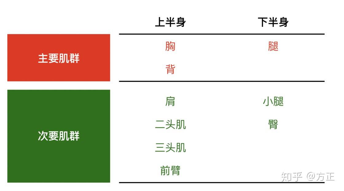 需要注意的是,虽然上图有「主要肌群」和「次要肌群」之分,但并不意味着次要肌群就不值得重视,而是我们在安排每日训练的时候,最好只安排一个主要肌群训练,再在其中穿插多个次要肌群。