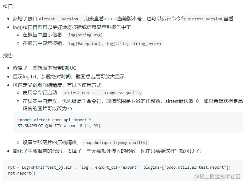Airtest更新了版本,关于log()接口,和报告生成的LogToHtml有了一些改动,可以更好地显示报错信息并且简化了生成报告的代码等;另外还新增了脚本图片精度压缩的配置项,具体请查看Airtest更新公告:github.com/AirtestProj…