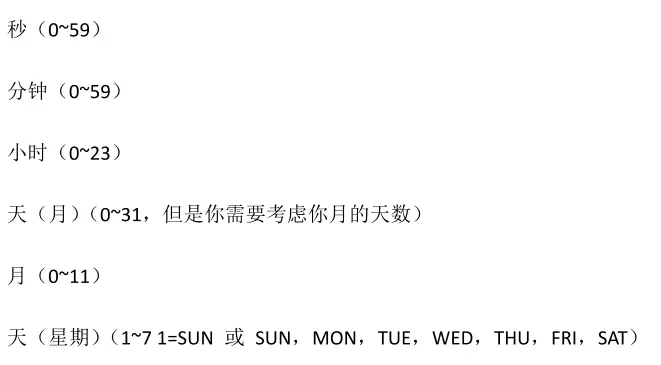 克隆表达式由7个部分组成的,对应上面的6个'*'和'?',分别表示秒,分,时,月日期,月份,周,年(可选)。各个部分用空格隔开。