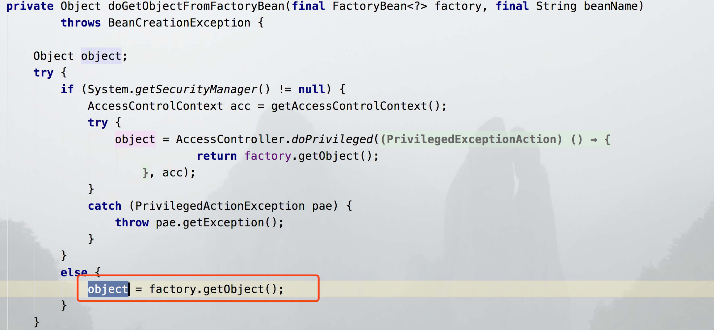 如上图所示,普通的bean,走到红框的位置的时候,就返回了。FactoryBean会继续向下,调用当前bean的Object方法。