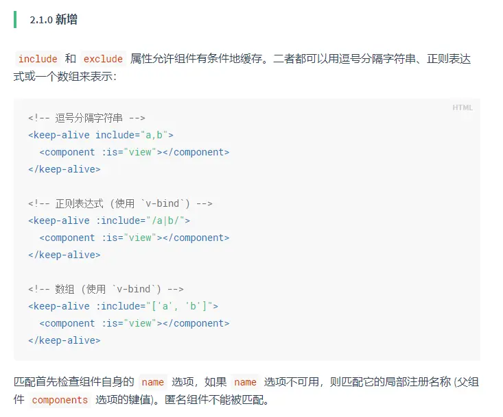 这时在上面需求中就会出现问题,因为即便2个url不一样的详情页面name="info",用到的详情组件是一样的。只是url不同,获取到的详情页数据也不同。这时设置的exclude属性会将这个组件销毁,即便它url不一样。