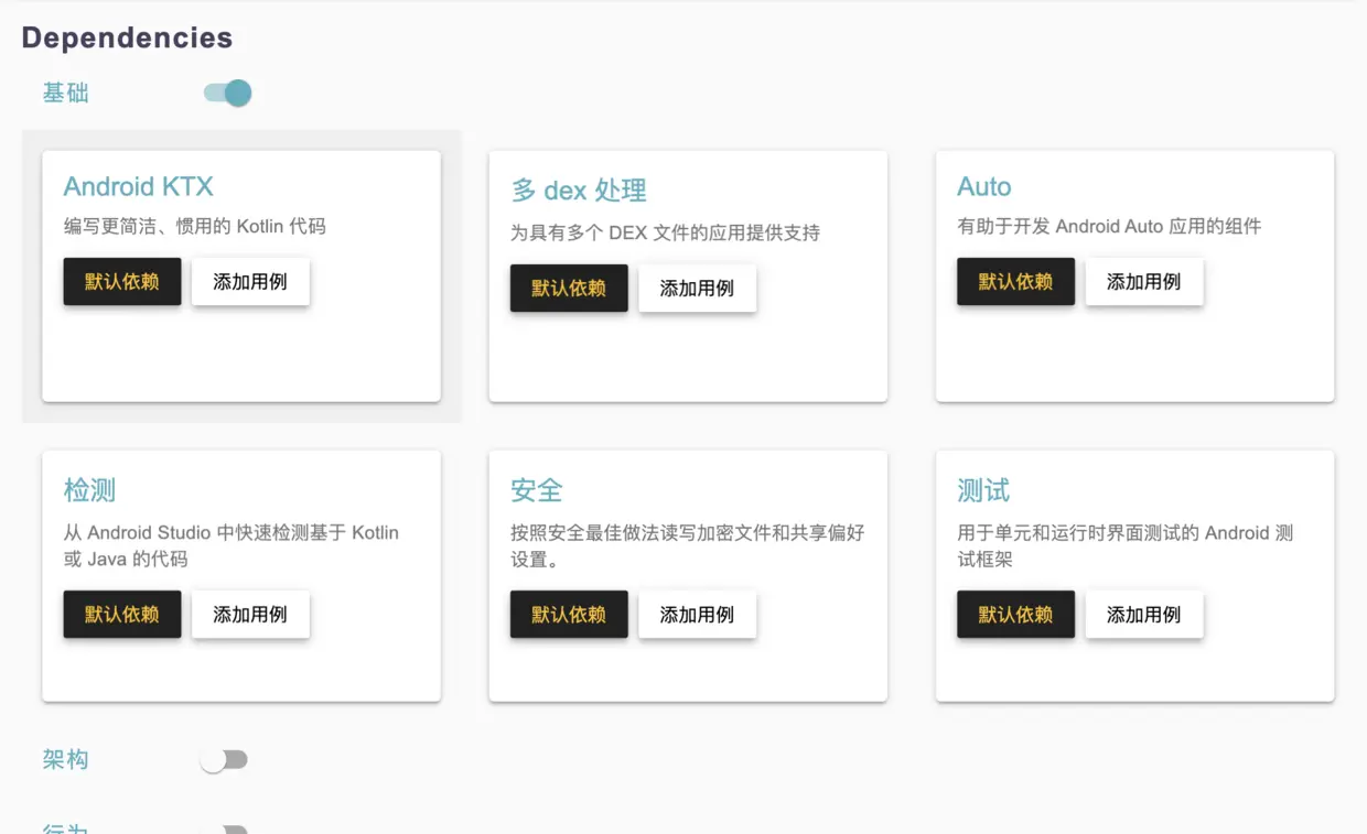 - 选择要集成的框架,集成框架分为默认依赖,就是在build.gradle中添加基础依赖,添加用例的话就是添加基础的封住+demo示例。