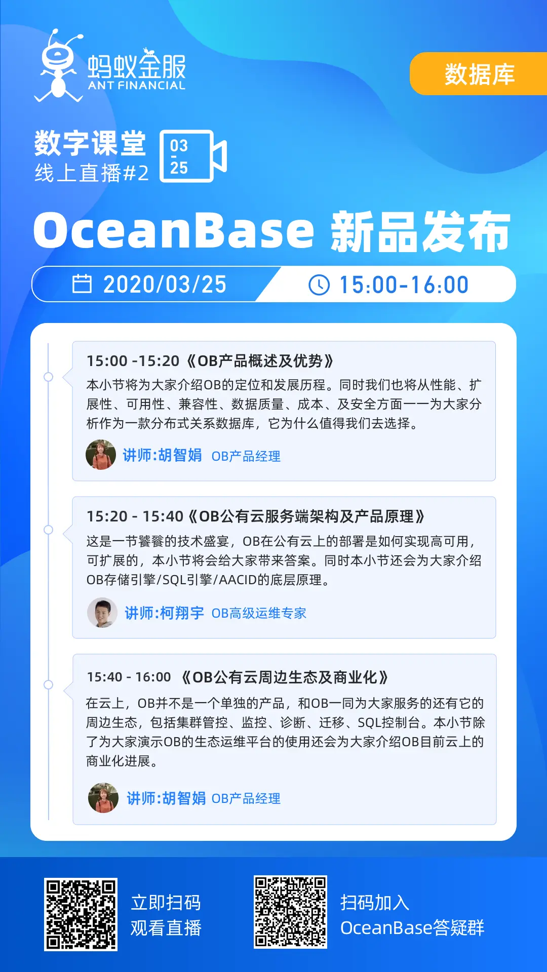 3月25日,走进阿里云云栖号在线课堂, OceanBase新品发布!一起来了解下OceanBase的前世今生。扫描二维码即可参与发布会。