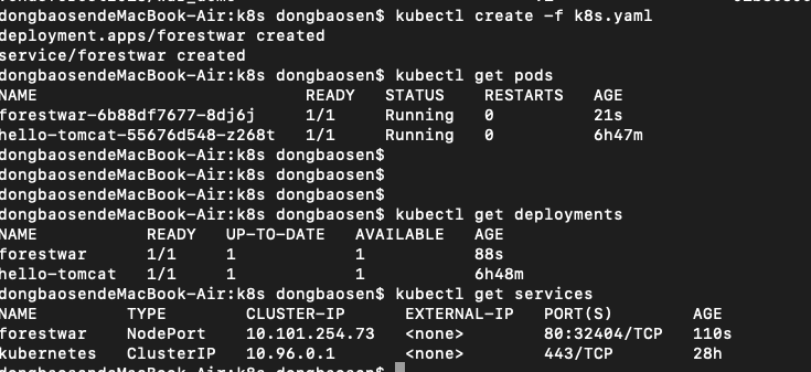 kind: DeploymentapiVersion: apps/v1metadata: labels: app: forestwar name: forestwar namespace: defaultspec: replicas: 1 selector: matchLabels: app: forestwar template: metadata: labels: app: forestwar # Comment the following annotation if Dashboard must not be deployed on master annotations: scheduler.alpha.kubernetes.io/tolerations: | [ { "key": "dedicated", "operator": "Equal", "value": "master", "effect": "NoSchedule" } ] spec: containers: - name: forestwar image: venusforest2013/war_demo:v1 imagePullPolicy: Always ports: - containerPort: 80 protocol: TCP---kind: ServiceapiVersion: v1metadata: labels: app: forestwar name: forestwar namespace: defaultspec: type: NodePort ports: - port: 80 targetPort: 8080 selector: app: forestwar- 查看k8s集群