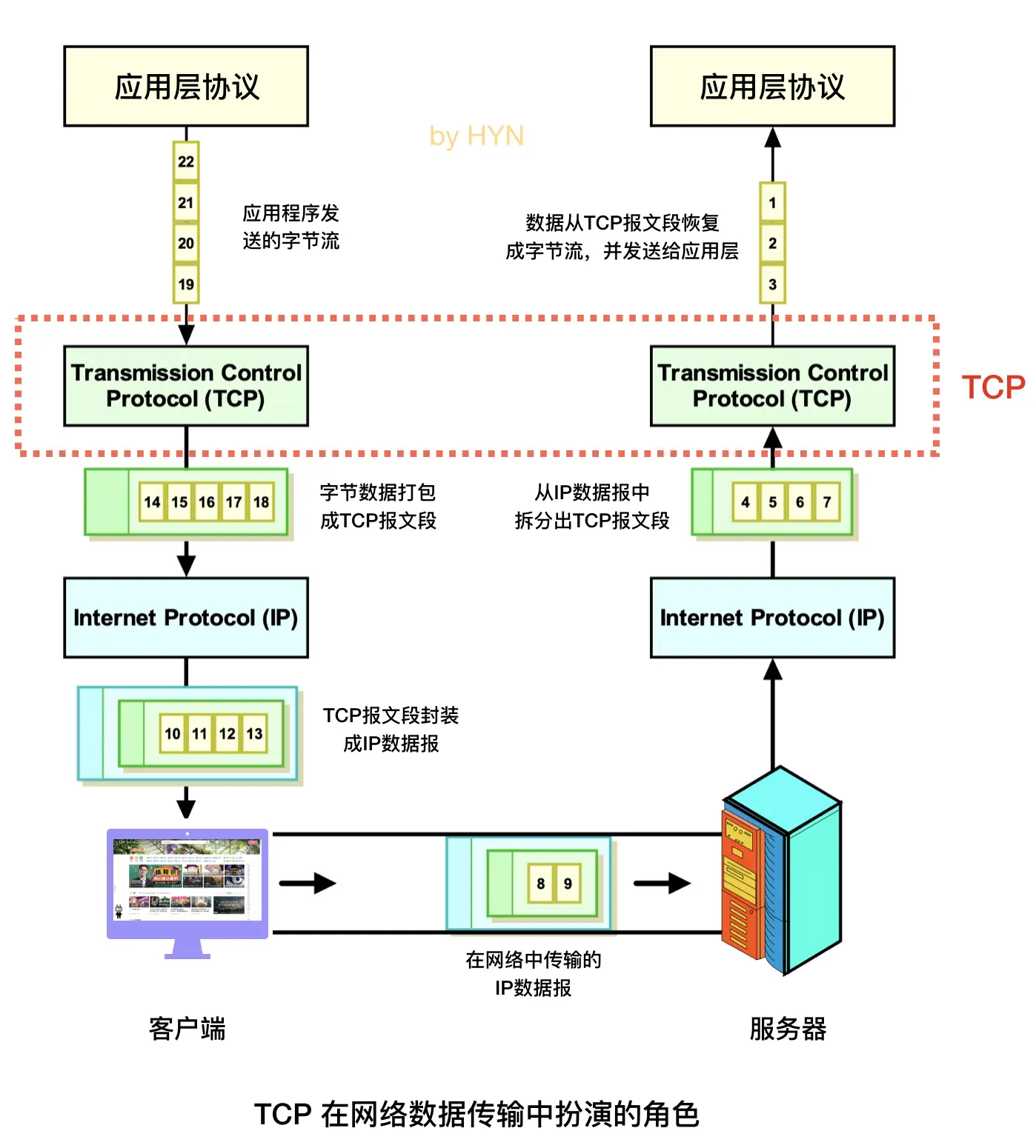 TCP(Transmission Control Protocol,传输控制协议) 是计算机网络的的重要组成部分,也是网络编程的重要内容,还有我们平时接触最多的 HTTP 也是基于 TCP 实现的。TCP 可以说是最重要的传输层协议,既然如此,作为开发人员,就有必要把 TCP 的核心概念和原理搞清楚。除此之外,诸如三次握手、四次挥手、滑动窗口和拥塞控制这些概念更是高频面试题,这就更有理由深入学习一下 TCP 了,本文就为大家详细梳理一下 TCP 的核心概念和原理。注:由于本文图片较多,标注有 by HYN 的图片为作者自制,其它来自于网络或参考资料,侵删
