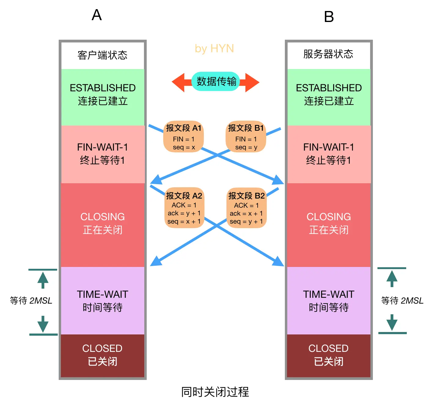 这种情况下,双方应用层同时发出关闭命令,这将导致双方各发送一个 FIN,两端均从 ESTABLISHED 变为 FIN_WAIT_1,两个 FIN 经过网络传送后分别到达另一端。收到 FIN 后,状态由 FIN_WAIT_1 变迁到 CLOSING,并发送最后的 ACK,当收到最后的 ACK 时,为确保对方也收到 ACK,状态变化为 TIME_WAIT,并等待 2MSL 时间,如果一切正常,随后会进入 CLOSED 状态。