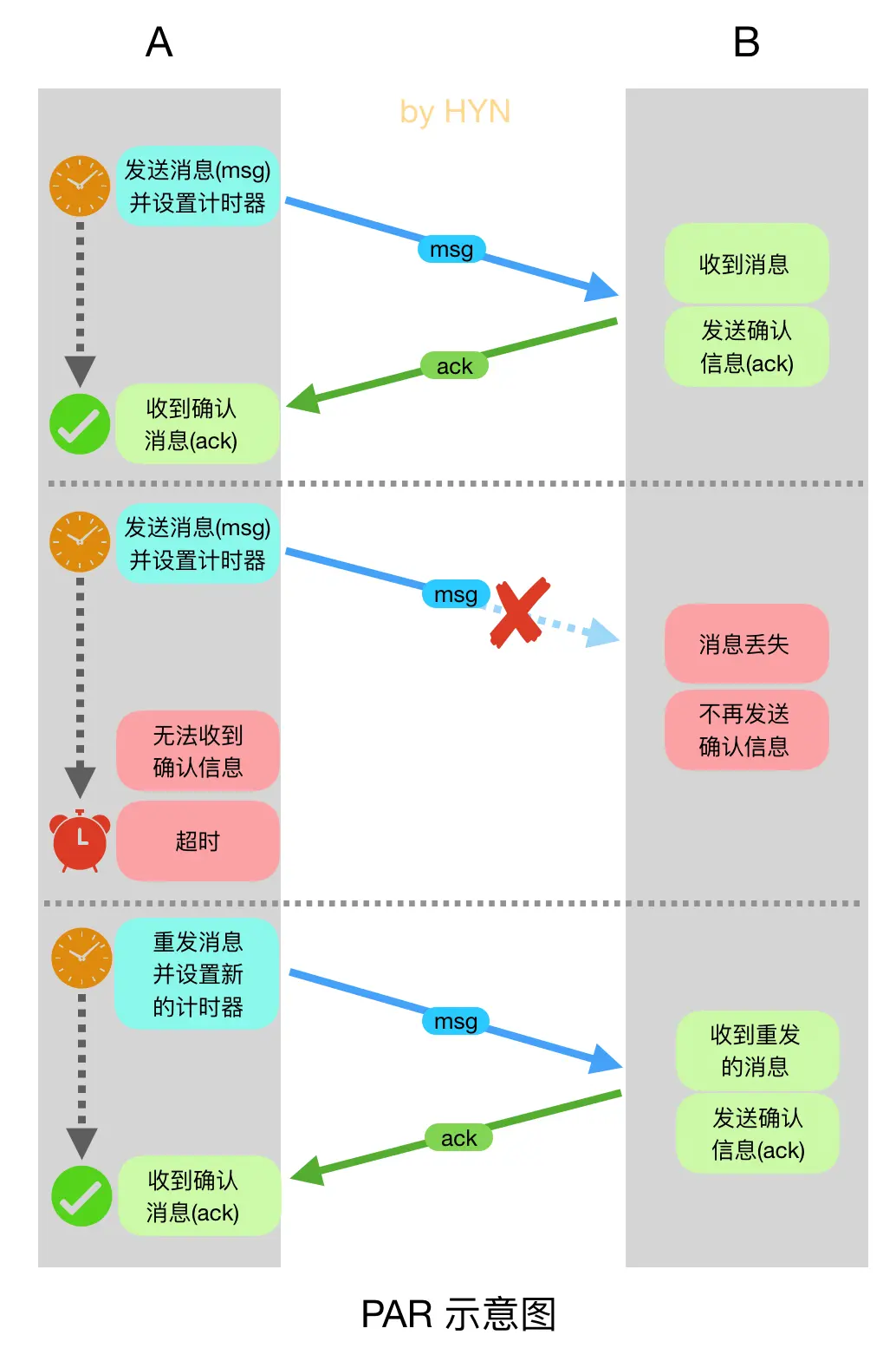 顾名思义就是发送方在发送一个数据包后就停止发送,等待对方响应 ACK,然后才能继续发送数据。这种模式的具体实现为 Positive Acknowledgment With Retransmission (PAR),意为带重传的肯定确认协议,其实现方式如下图所示: