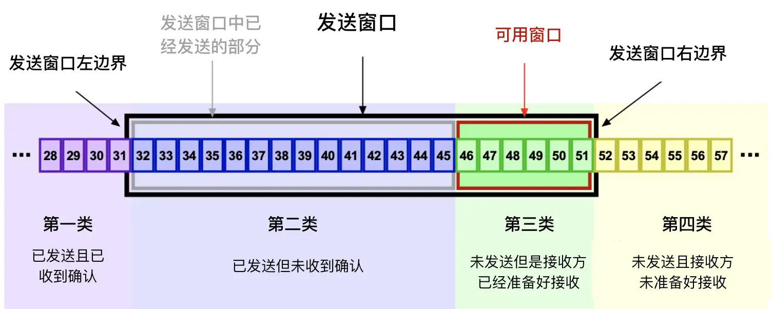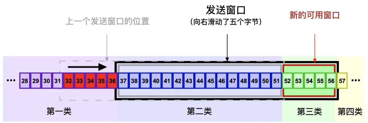 我们可以把发送方的发送缓存中的字节分为以下四类,每个编号对应一个字节: