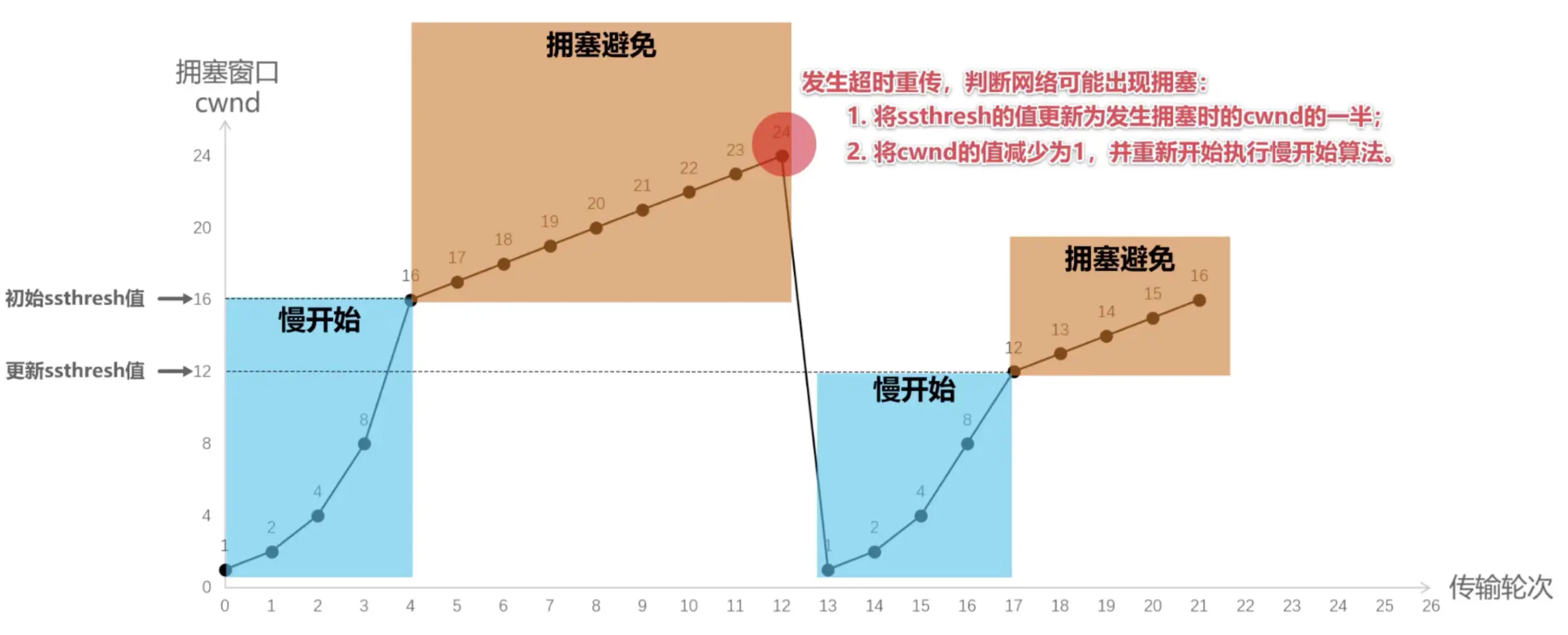 当cnwd < ssthresh,使用慢开始算法 当 cnwd = ssthresh,既可使用慢开始算法,也可以使用拥塞避免算法 当 cnwd > ssthresh,使用拥塞避免算法