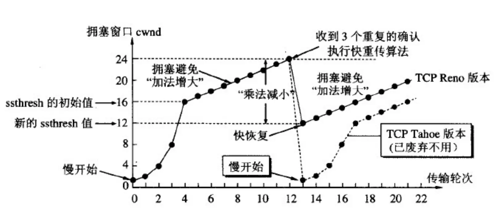 当发送方连续收到三个重复确认时,就执行“乘法减小”算法,把 ssthresh 门限减半。 但是接下去并不执行慢开始算法。考虑到如果网络出现拥塞的话就不会收到好几个重复的确认,所以发送方现在认为网络可能没有出现拥塞。所以此时不执行慢开始算法,而是将 cwnd 设置为 ssthresh 的大小, 然后执行拥塞避免算法。