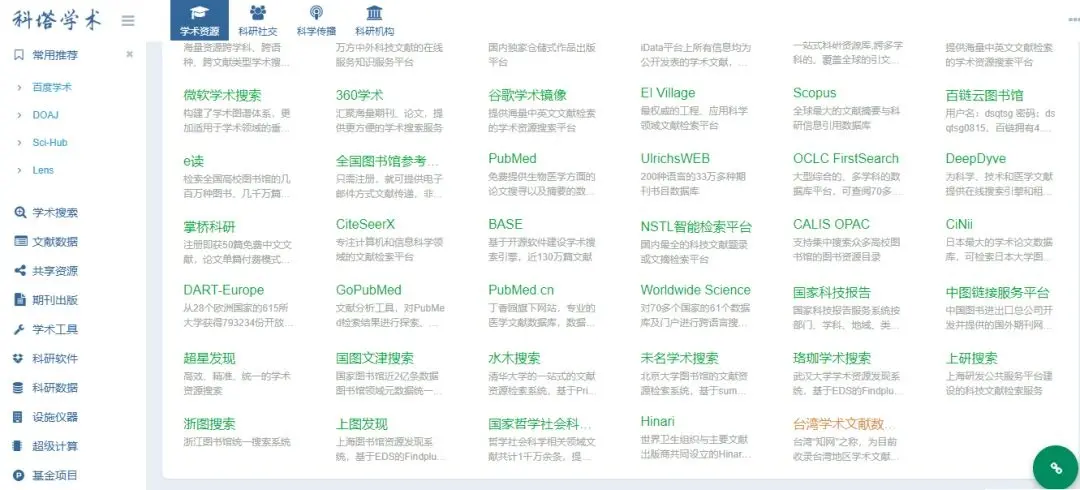 科塔学术导航网站包含包括学术资源、科研社交、科学传播、科研机构四个模块。在这里你可以轻易找到学术研究所需要的网站、工具、文献数据等。