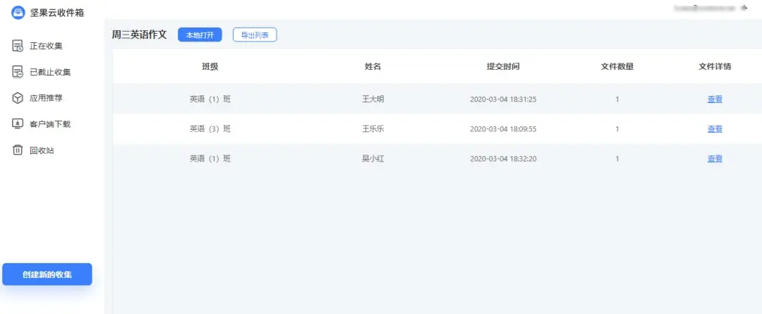 使用坚果云收件箱,网页和微信小程序皆可创建收集,一键分享链接给学生,自动收集作业,自动重命名,简单快捷。
