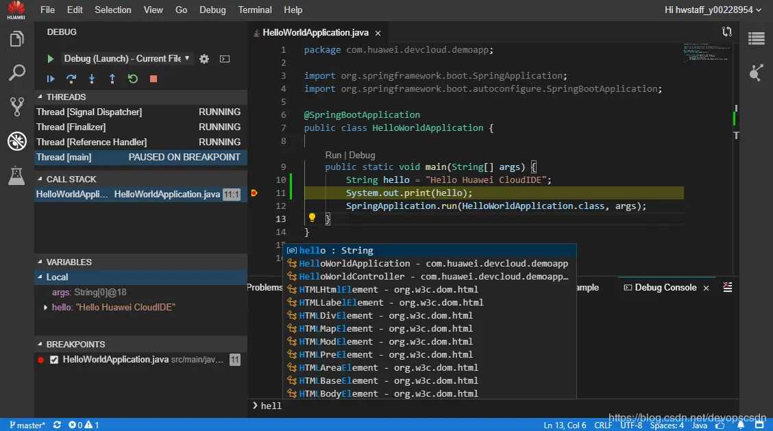 调试:目前华为云CloudIDE提供了主流语言(C/C++、Java、Python、NodeJs、Go等)的开发支持,无论是代码高亮、自动补全还是调试都能完整支持(如图2)。