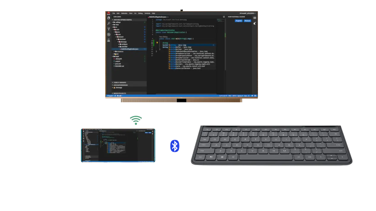 移动互联网应用开发在十几年的发展中形成了成熟的架构,从最早的Native App到嵌入了本地浏览器控件的Web App,再到现在最为主流的混合型App,整个发展过程中HTML5技术发挥了极其重要的作用,不仅解决了Native App开发维护成本过高和跨平台兼容维护困难的问题,也能保证跨设备应用的一致性体验,真正实现一次开发随处运行。华为云DevCloud的CloudIDE也正是采用了同样的技术来构建应用,所以无论是PC、Pad还是手机都能获得相同的体验。只要你身边有一台手机,你就能轻松接入开发环境,再将手机投屏到电视上、配上蓝牙键盘,立马还原出一个熟悉的开发环境和编码体验。