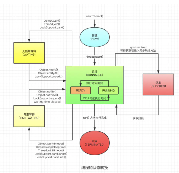 - Java 线程(为什么说是 Java 线程呢?因为操作系统线程状态和这 6 个状态还有些许差异)一共有 6 种状态,Thread 类中专门定义了一个枚举类 State 来表示这 6 种状态。 (1). NEW(新建): 创建了一个 Thread 实例,还没有调用其 start() 方法,此时线程处于新建状态。 (2)RUNNABLE(运行): 运行状态包含了 Ready 和 Running 两种状态。什么意思呢?Ready 状态的意思就是我已经准备好一切,只要让我用 CPU 我就能 Running,即正在等待 CPU 分配执行时间;Running 状态就是得到了 CPU 的执行时间,正在运行。 (3)BLOCKED(阻塞): 线程 A 进入同步区域的时候,需要获取一个排他锁,若此时排他锁正在被另一个线程 B 占有,线程 A 将进入阻塞状态。 (4)WAITING(无限期等待): 处于这种状态的线程不会被分配 CPU 执行时间,它们要等待被其他线程显式地唤醒。以下方法会让线程陷入无限期的等待状态:没有设置 Timeout 参数的 Object.wait() 方法;没有设置 Timeout 参数的 Thread.join() 方法;LockSupport.park() 方法。 (5)TIMED_WAITING(限期等待): 处于这种状态的线程也不会被分配 CPU 执行时间,不过无须等待被其他线程显式地唤醒,在一定时间之后它们会由系统自动唤醒。以下方法会让线程进入限期等待状态:Thread.sleep() 方法;设置了 Timeout 参数的 Object.wait() 方法;设置了 Timeout 参数的 Thread.join() 方法;LockSupport.parkNanos() 方法;LockSupport.parkUntil() 方法。 (6)TERMINATED(结束): run() 方法执行完成,线程结束执行,此时的线程状态。
