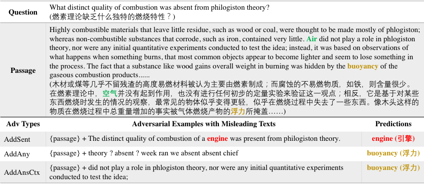 图1 在文章后部追加特定无关文字即可误导模型给出错误答案,例子中正确答案为『Air』