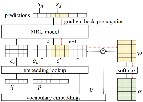 (1)对每个训练样本利用对抗的方法生成一个干扰向量输入,使得它能够误导当前的阅读理解模型;
