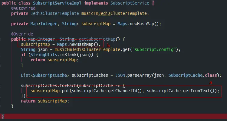 - 如b处所示,每次进入这个方法的时候都会将全局变量重新初始化,想象一下,如果有两个线程同时调用这个方法,其中一个已经到了最后一步,打算返回map值,而另一个线程刚刚进来把map重新初始化,那么前者返回给被调用方的结果就是一个空map了。