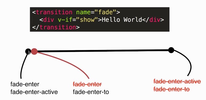当元素被<transition>包裹后,Vue会自动分析CSS样式并构建一个流程,在动画执行的一瞬间,在div中增加两个class名字:fade-enter和fade-enter-active,在动画进行第二帧时,删除fade-enter增加fade-enter-to,fade-enter-active一直存在到结束时都删除掉。