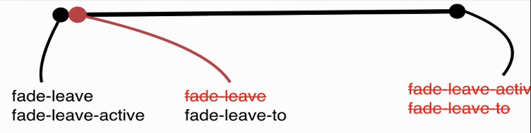 fade-enter定义在动画开始时,透明度为0(完全没有),认为没有显示;当动画第二帧开始,fade-enter被删除,opacity值逐渐线性恢复默认的1,即正常显示。这时,fade-enter-active生效,通过始终存在的transition: opacity 2s设定恢复时间为2s。- 由于出现结束透明度为默认的1,所以