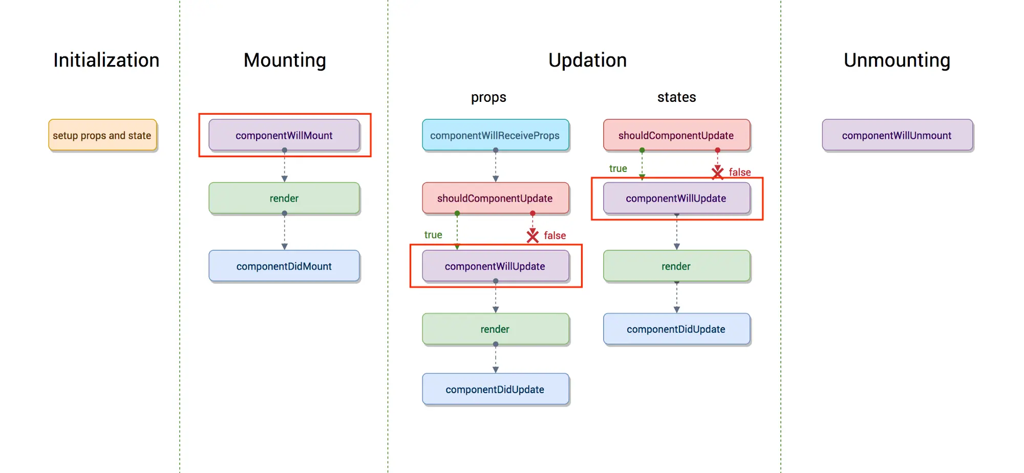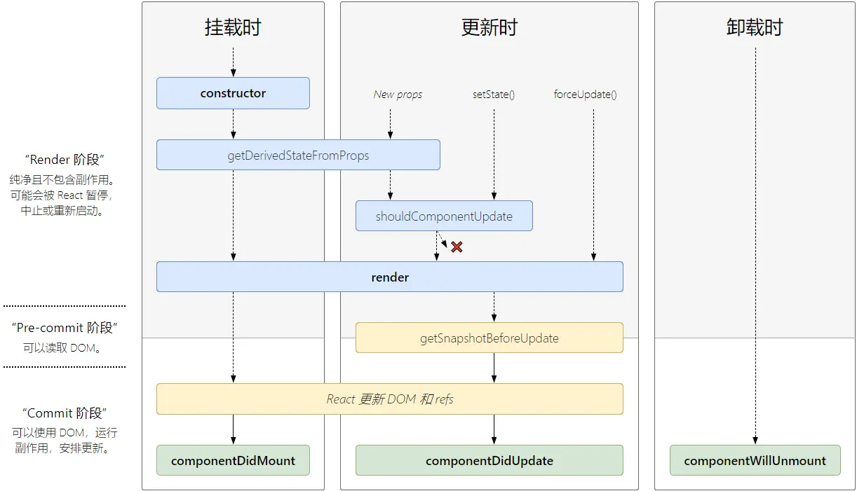 上图官网展示的,最新稳定的生命周期表,去除了即将失效的componentWillMount和componentWillReceiveProps、componentWillUpdate
